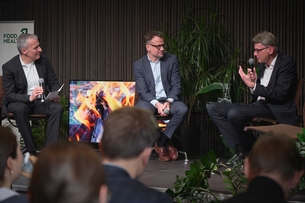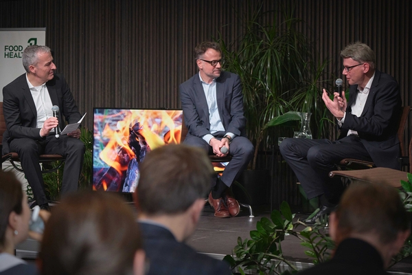 Foto: Regierungsräte Kaspar Sutter (Kanton Basel-Stadt, Bildmitte) und Dieter Egli (Kanton Aargau, rechts im Bild) beim «Kamingespräch» mit Lukas Schüpbach, Mitglied des Strategiegremiums von FoodHealth. (© David Walter)