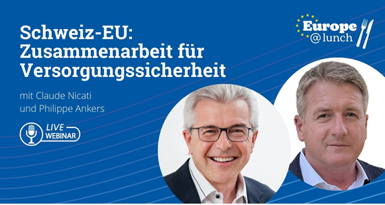 Mit dieser Veranstaltung setzt die Europäische Bewegung Schweiz ihre Reihe Europe@lunch fort. Es diskutieren Claude Nicati, Mitglied des Verwaltungsrats bei Swissgrid, und Philippe Ankers, Leiter Internationales beim Bundesamt für Lebensmittelsicherheit und Veterinärwesen (BLV).