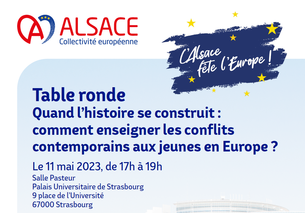 Am Donnerstag, 11. Mai 2023 lädt die Collectivité européenne d’Alsace (CeA) von 17.00 Uhr bis 19.00 Uhr im Palais Universitaire in Strasbourg zum Runden Tisch zur Frage wie es gelingt, Jugendlichen in Europa zeitgenössische Konflikte nahezubringen, ein.