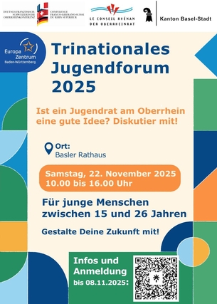 Am Samstag, 22. November 2025 von 10.00 Uhr bis 16.00 Uhr sind Jugendliche aus der Oberrheinregion zwischen 15 und 26 Jahren eingeladen, sich am trinationalen Jugendforum im Rathaus in Basel gemeinsam Gedanken zur Jugendpartizipation zu machen.