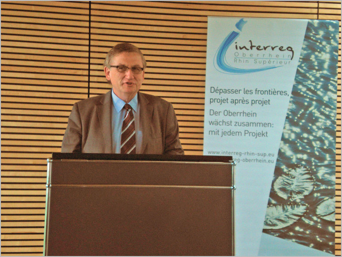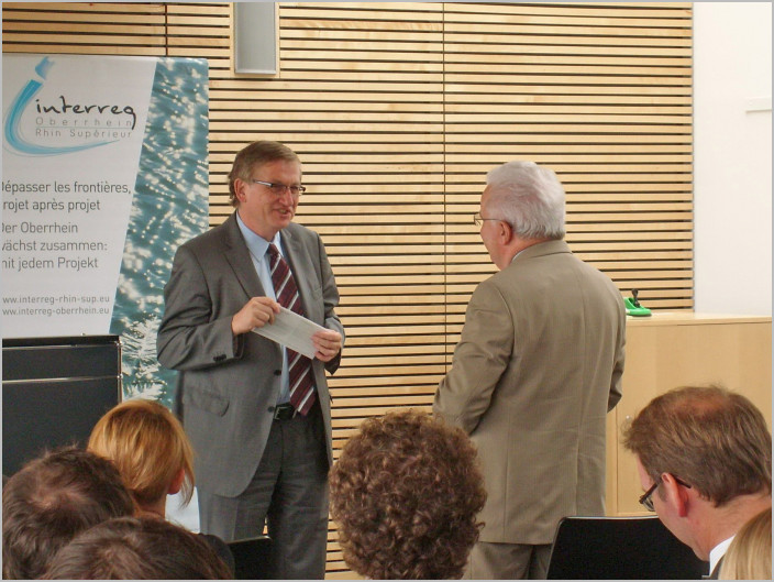 An diesem Tag wurde zudem der langjährige Vorsitzende der Arbeitsgruppe des Programms INTERREG IVA Oberrhein, Jean Paul Heider (ehem. Vize-Präsident des Conseil Régional d'Alsace), feierlich verabschiedet. Dr. Eric Jakob, Geschäftsführer der REGIO BASILIENSIS (IKRB), richtete an Herrn Heider einige Worte im Namen der Nordwestschweizer Kantone und betonte, es sei ganz wesentlich auch das Verdienst von Jean Paul Heider, dass der Oberrhein auf eine erfolgreiche Nutzung dieses wichtigen europäischen Förderinstruments bereits in der vierten Auflage blicken dürfe.