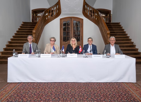 Foto: Vertragsunterzeichnung 17. Dezember 2025, Kooperationsvertrag zwischen Basel-Stadt und dem Südelsass Von links: Romain Henry (Directeur Adjoint, Caisse Primaire d’Assurance Maladie CPAM de Haute-Savoie), Corinne Krencker (Directrice, Groupe hospitalier de la Région de Mulhouse et Sud-Alsace GHRMSA), Christelle Ratignier-Carbonneil (Directrice Générale, Agence Régionale de Santé ARS Grand Est), Lukas Engelberger (Regierungsrat, Vorsteher Gesundheitsdepartement Basel-Stadt), Robert-Jan Bumbacher (Verwaltungsratspräsident, Universitätsspital Basel USB) © Rita Carubia