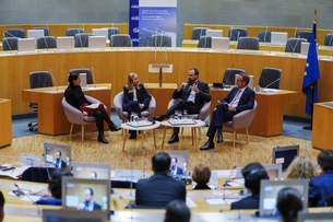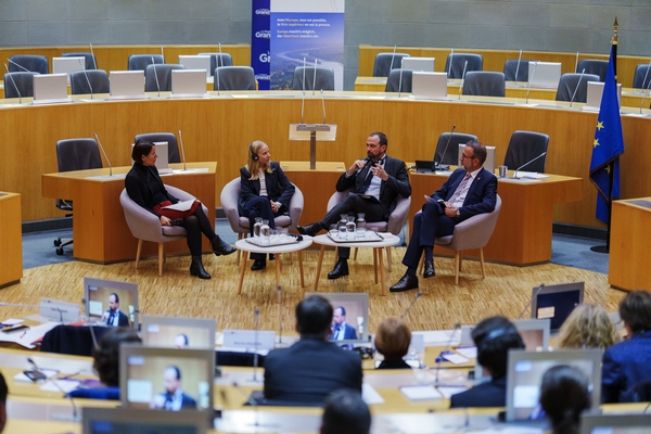 Foto: Martin Saladin, Direktor Standortförderung SECO (rechts) im Gespräch mit Sabrina Repp, Mitglied des Europäischen Parlaments, und Samuel Bouju, Generalsekretär für regionale und europäische Angelegenheiten der Präfektur Grand Est, moderiert von Dorothee Fischer (links).