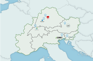Bildunterschrift: Die sechs Projektpartner aus Deutschland, Italien, Österreich, der Schweiz und Slowenien. Grün umrandet das Programmgebiet Interreg Alpenraum